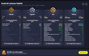 Il salto vero si vede con il livello Oro, dove entrano in gioco percentuali più interessanti, supporto dedicato e bonus esclusivi. Il Platino è invece il livello top: cashback fino al 5%, rakeback fino all’8%, manager VIP, assistenza prioritaria e prelievi più rapidi.