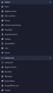 Bdmbet ha un catalogo di giochi da casinò molto vasto, toccando più di 10.000 titoli popolari e non, con una rete di 90+ provider. Questa sezione, come ben si intuisce, è suddivisa in nel classico casinò e quello live, come mostrato in screenshot.