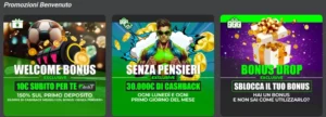 Il sito propone poi la promozione “Bonus Senza Pensieri”, cioè un sistema di cashback. Qui troviamo un 5% sulle perdite sportive mensili e un cashback casinò settimanale del 5% più uno mensile del 6%. Però il cashback settimanale è un fun bonus con rollover 50x, quindi nella pratica è più difficile da convertire in saldo reale. Il cashback mensile casinò è invece più interessante perché ha giocabilità 1x, risultando molto più semplice da sfruttare.