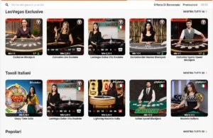 Ci sono titoli di slot popolari come Starburst e Dead or Alive, e nel live Crazy Time, Lightning Roulette Italia, Monopoly Live, Sweet Bonanza Candyland, Live Mega Ball, Bac Bo Live, Immersive Roulette, Punto Banco e tavoli blackjack dedicati. Il catalogo ha anche una componente esclusiva/proprietaria: il bookmaker spinge la linea LeoVegas Originals e tavoli brandizzati, dove sono disponibili LeoVegas Dolce Vita Roulette, LeoVegas Red Baron e altre voci marcate “Esclusivo”.