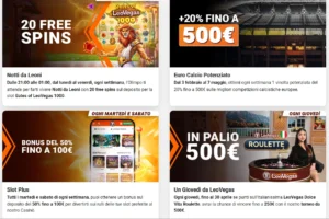 - Le promo ricorrenti che si vedono anche nei tuoi screenshot sono reali: Notti da Leoni richiede 20€ di deposito e 80€ di gioco sulle slot tra le 21:00 e l’1:00, e paga 20 free spins; Domenica Spin richiede 20€ di deposito e 500€ di volume totale per sbloccare fino a 50 free spins, con scadenza dei free spins di 3 giorni; Leo Fedeltà assegna fino a 1.000€ al mese in bonus reale, con bonus da richiedere entro 48 ore.