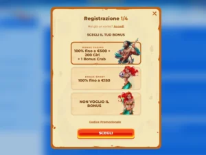 Nella stessa schermata ti fa scegliere “SCEGLI IL TUO BONUS” con 3 opzioni: Bonus Casinò: “100% fino a €500 + 200 Giri + 1 Bonus Crab” → selezionalo se vuoi giocare soprattutto alle slot/casinò. Bonus Sport: “100% fino a €150” → selezionalo se vuoi puntare sulle scommesse sportive. “NON VOGLIO IL BONUS” → se vuoi registrarti senza vincoli/condizioni bonus.