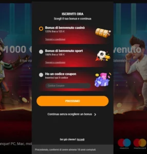 Con un deposito minimo di 20€, puoi attivare un bonus progressivo su 4 depositi, usando i codici: