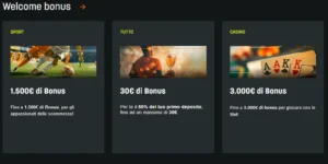 Per il casinò c’è il bonus di benvenuto fino a 3.000€, che offre subito 1.000€ di Play Bonus senza deposito e un ulteriore 200% fino a 2.000€ sul primo versamento, a condizione che venga effettuato entro 30 giorni dalla registrazione.