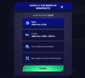 Il bonus Sport prevede un 100% fino a 150€ sul primo deposito. Per ottenerlo è necessario registrarsi, depositare almeno 20€ in un’unica transazione e puntare l’intero importo del deposito con quota minima 1.50.