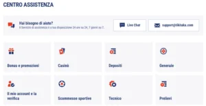 Tikitaka offre assistenza in italiano tradotto, con live chat, email e Help Centre/FAQ; il sito ha un team multilingue 24/7. L’email è segnalata nello screen, e il supporto risponde entro le 48 ore, in modo approfondito e molto più dettagliata che ne via chat. Via chat appunto, l’attesa è minima, sui 1/2 minuti, e rispondono reattivamente in modo abbastanza esaustivo, per richieste più basiche. La FAQ invece è ampia: depositi, prelievi, scommesse, verifica account e problemi comuni coperti.